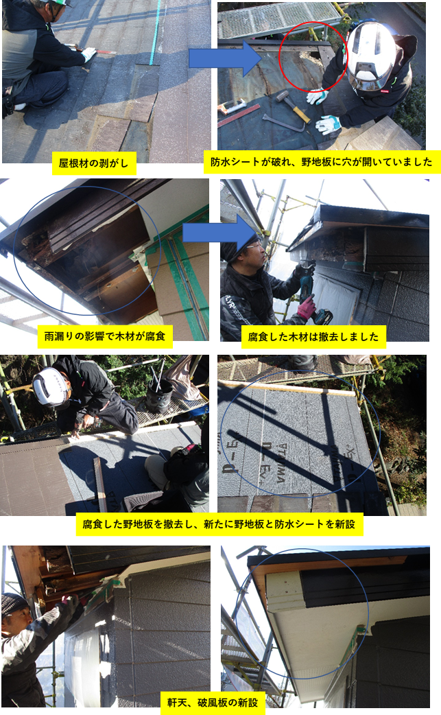 さらに屋根材を剥がして確認すると、下地の野地板が腐食し、穴が空いている状態でした。