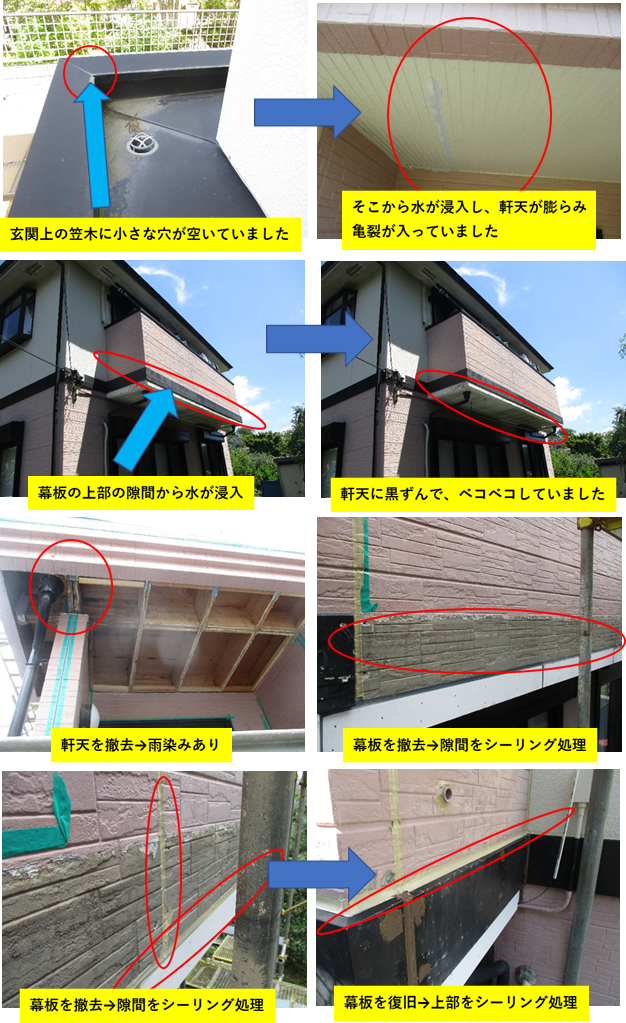 どこから水が廻っているのか?の雨漏り調査を実施しました。結果、笠木の穴、幕板の隙間から水が浸入し、軒天に染みが出ていることがわかりました。