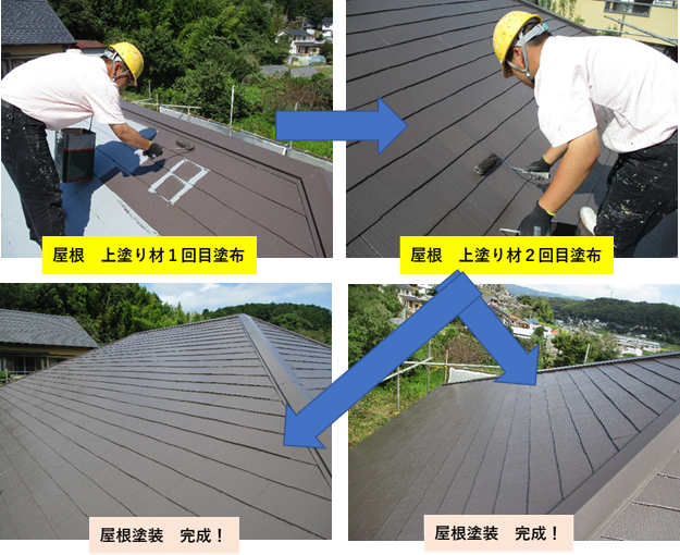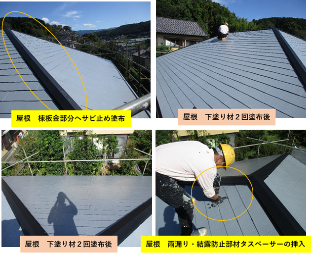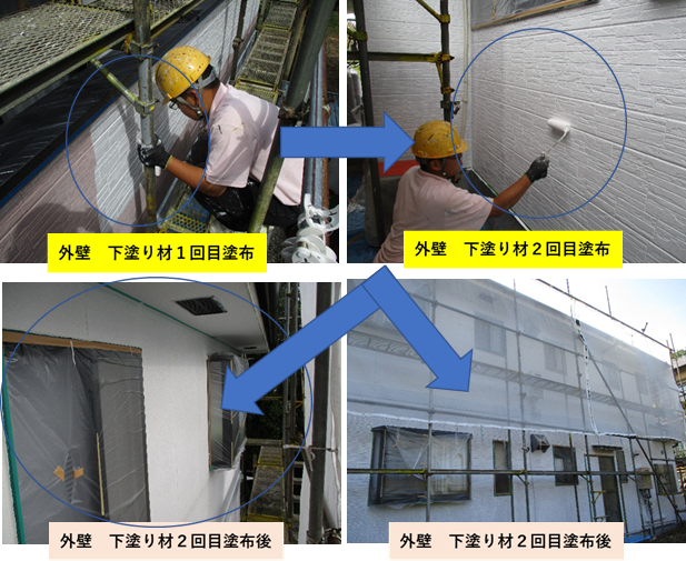 屋根・外壁ともに下塗りを2回行い、塗料の密着性と耐久性を高め、