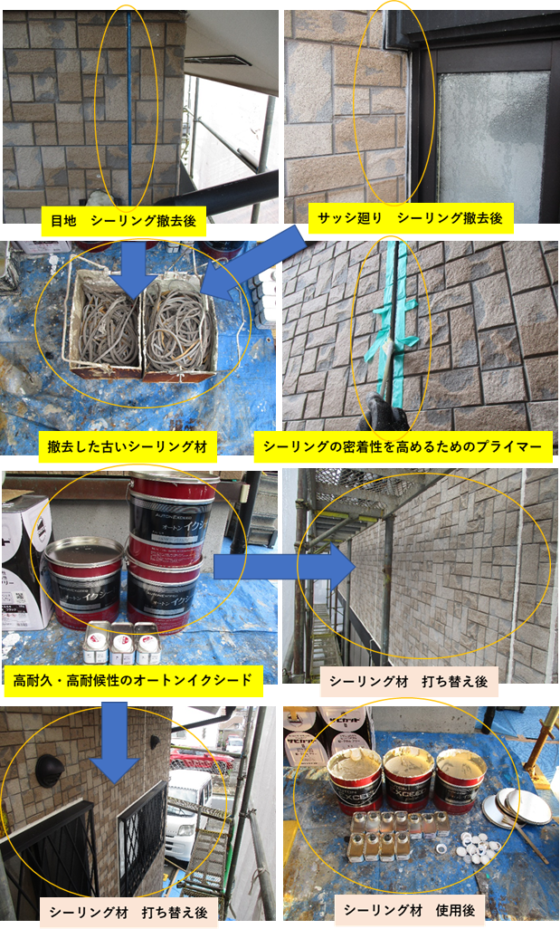 弾力のある新しいシーリング材を打ち直して、目地からの雨水の侵入をしっかり防ぐ仕上がりにしています。